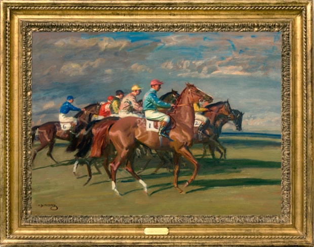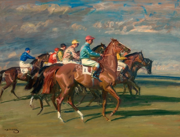 Munnings began his series of 'Start' paintings in the early 1940s and continued until his death. In virtually all of such compositions, Munnings excludes elements such as the race marshall, crowds or grandstands and focuses exclusively on the field of horses; by removing these distractions, the sense of tension and excitement, which exists prior to the start of a race, is increased markedly. The setting of Newmarket, with its broad, open heathland and big sky contrasts beautifully with the vivid jockeys' silks and provides a fitting backdrop to frame the scene. Munnings was even given permission by The Jockey Club to set up a studio at the course, in an old rubbing-down barn. The series represents another instance of the artist pioneering away from formal equestrian portraiture and instead painting racehorses very much in their element. He provides a telling recollection in his biography, 'I am standing on the course -- the most beautiful course in the world: cloudless October sky, a faint wind from the east....I am looking at the scene, the old, old scene -- a centuries old scene. Horses come up the course looking like those of years ago....Bright colours in the sun just the same as of yore....What a sight for the artist! with the long shadows and the lights on the boots, lights on the horses....This is the best picture I have ever seen.' (Sir Alfred Munnings, The Finish, London, 1952). The present work is undoubtedly one of the most important in the series as it shows a named jockey and horse, whereas in the majority of other 'Starts', the field is anonymous. High Stakes, by Lord Derby's 1933 Derby winner Hyperion out of 1929 Oaks winner Pennycomequick, was one of numerous racehorse commissions from Lord Astor. Sir Gordon Richards (1904-1986) is considered to be one of the greatest jockeys in the history of the turf with 4870 wins. He was British flat racing champion 26 times and, along with A.P McCoy, is the only jockey to receive a Knighthood. In 1926, his debut year, he rode to victory in 118 races. He missed the 1927 season having contracted tuberculosis but recovered the following year. 1932 saw him break the record for wins in a season with 259, a record he broke in 1947 with 269 wins. He won all of the classic races on numerous occasions, except the Derby which eluded him until 1953, when he finally rode Pinza to victory, overtaking the Queen's horse Aureole and the Aga Khan's Shikampur in the final two furlongs.