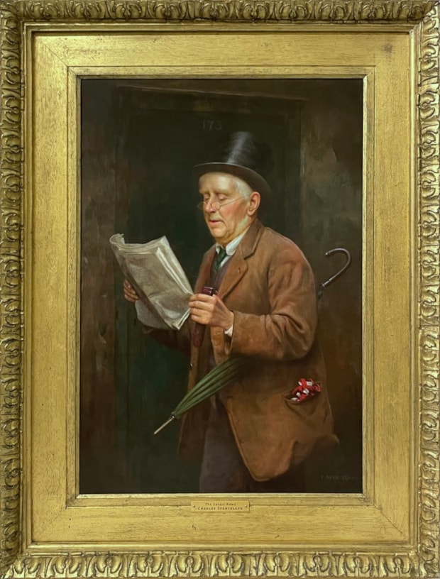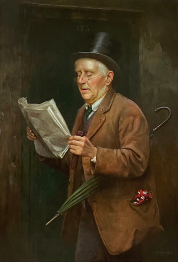Spencelayh became famous for his figure subjects, portraits and genre scenes. When painting, a new picture would be considered long and hard before a design was sketched, and then in his studio he would effectively build a ‘set’ employing a model for the principal character. A picture could take months to complete, but he painted with very little monetary appreciation. He achieved great popularity during his lifetime, although he was not accepted in artistic circles. His son, Vernon Spencelayh (b.1891), once commented, “Dad went his own way and ignored any advice from other artists. In fact, he was an isolationist”.