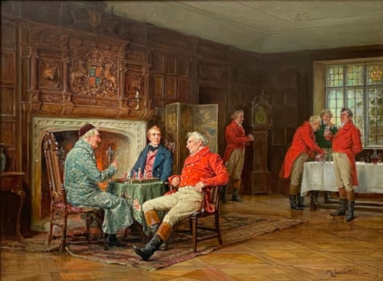 Bennett however, turned to painting historical genre and portraits and it was with the former that he achieved critical acclaim. He portrayed life in 17th and 18th century England, figures in tavern interiors or travellers gathered before a coaching inn, huntsmen carousing after the hunt or gentlemen discussing affairs of State, subjects which found a ready market amongst collectors in the United Kingdom and the United States in particular.