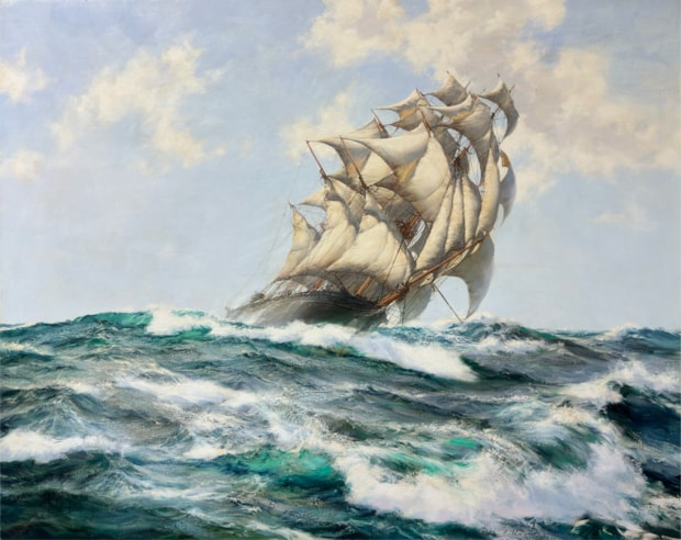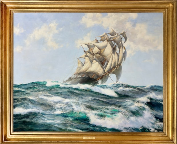 Montague Dawson was born in London, the son of a sea captain.  His grandfather was the successful Midlands landscape painter, Henry Dawson (1811-1878) who had himself moved to Chiswick.  Montague Dawson studied under the marine painter Charles Napier Hemy (1841-1917) who, born in Newcastle, lived in London for some years before moving to Falmouth.  On completing his studies, Dawson joined a commercial studio specialising in nautical illustrations.