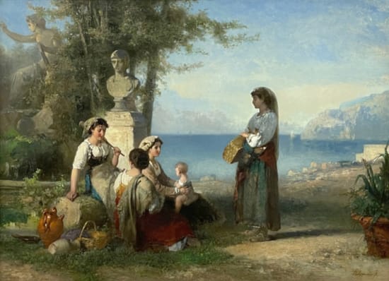 It was in Venice that Eugene de Blaas established himself as the leading painter of Venetian genre. The golden Italian climate and the magnificent old stone facades had made Venice an essential stop on the Grand Tour since the early eighteenth century. Past visitors had returned home with views and portraits; the late nineteenth visitor wanted more. The affluent Venetian visitor wanted human interest, a sense of life by the canals and campos of the city, as a result of which, a school of artists developed to supply this market.