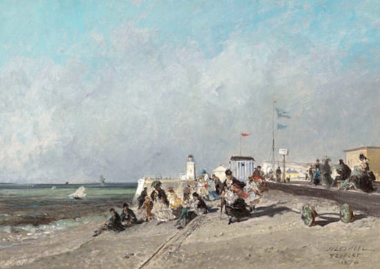 Boudin associated with a number of artists including Théodule Augustin Ribot (1823-1891), Thomas Couture (1815-1879), Constant Troyon (1810-1865) and Louis-Gabriel-Eugène Isabey (1803-1886), and was encouraged to move to Paris to study. Success eluded him; however in 1859 Boudin was awarded a grant by the City of Le Havre to study in Paris for three years. Boudin travelled extensively and would do so all his life, in his early years painting in Normandy and Brittany.