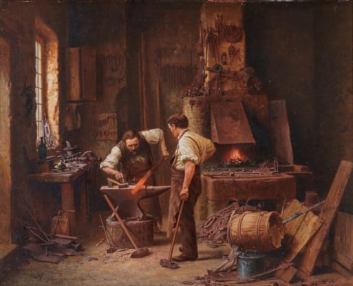An admirer and follower of Queen Victoria’s best loved artist Sir Edwin Henry Landseer (1802-1873), Edwin Douglas lived in Edinburgh and studied at the Royal Scottish Academy Schools. He first exhibited at the Royal Scottish Academy itself in 1865, subjects in his early years being Scottish genre and historical scenes. In 1871 as with so many of his compatriots, Douglas moved to London in search of patronage and commissions, having exhibited firstly at the Royal Academy in 1869. He lived in Bedford Gardens subsequently moving to Dorking in 1873 and to the village of Shere near Guildford in 1875. Douglas continued to paint Scottish subjects throughout his life, but interspersed with portraits and genre. However, it was as a painter of animals and most particularly dogs, for which he was so widely known and admired. It is in his portrayal of dogs that Douglas excelled. As with Landseer, his works can be highly sentimental and his dogs imbued with an anthropomorphic quality. Douglas was a highly successful artist whose animal paintings, like those of Landseer, struck a chord with Victorian collectors. He exhibited at the Royal Academy 1869-1900, forty one works in total, at the Royal Scottish Academy and other venues in London and the provinces. Having moved to Findon in Sussex in 1891, Douglas died in 1914. Museums: Queen Elizabeth II; Tate Gallery, London