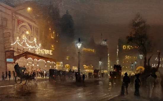 George Hyde Pownall was a painter of evocative London Street scenes, often at night. Like many artists of the period very little is known of his career, although he is known to have painted very attractive, usually small pictures of London. He painted in the tradition of John Atkinson Grimshaw (1836-1893) and James Abbott McNeil Whistler, PRBA (1834-1903) combining the effects of fine detail with the loose manner of impressionism.
