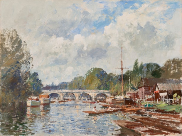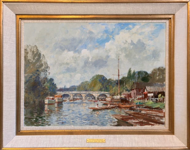 The Second World War saw Seago serving with the Royal Engineers 1939-1944 and continuing to paint, the result being an exhibition of his war paintings in 1946 shown in Norwich and Bristol. In this same year, Seago was elected to the Royal Society of British Artists. He exhibited widely, at the Royal Academy, Royal Hibernian Academy, Royal Society of Portrait Painters, The Royal Society of Painters in Watercolour, to which he was elected a member in 1959, the Paris Salon and in many other institutions. Seago travelled widely, painting in Morocco, Greece, Italy, Spain and in France to which he sailed, venturing up the Seine to Paris in his yacht. Seago was equally at home painting the Norfolk landscape as the cities of Hong Kong, London and Paris. In 1957 an exhibition of his paintings of the Duke of Edinburgh’s world tour was shown at St James’s Palace. Seago also painted Queen Elizabeth II, the Queen Mother and Princess Margaret, and was as at home with royalty and his aristocratic patrons as he was with fellow members of the Ipswich Art Club and Norwich Art Circle. His one-man shows in the 1960’s drew huge audiences, such that buyers were rationed to only one work per exhibition. He died in London, 19th January 1974.